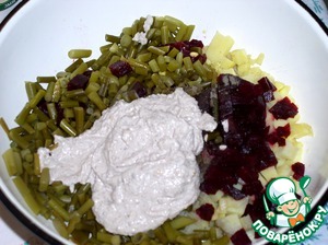Отварные овощи очистить и нарезать меленьким кубиком. Побеги чеснока "настричь" ножницами кусочками около 1 см.