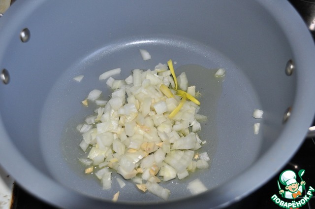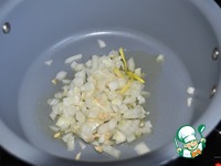 Лук и чеснок режем мелкими кубиками и обжариваем 1 минуту на сильном огне на растительном масле в сотейнике.