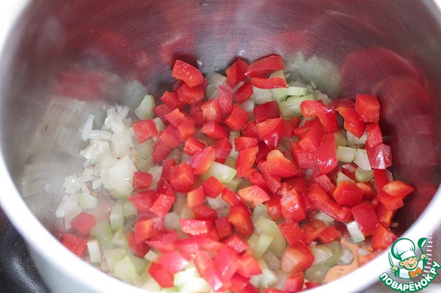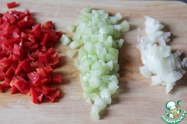 Лук мелко нарезать, болгарский перец и сельдерей нарезать на небольшие кубики.