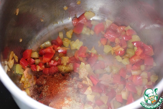 К овощам добавить паприку и кумин и, постоянно помешивая, прогреть еще с минуту.