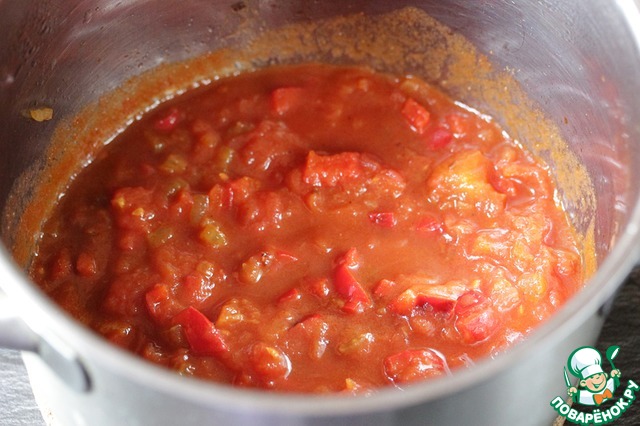 Добавить в кастрюлю измельченные томаты, перемешать.