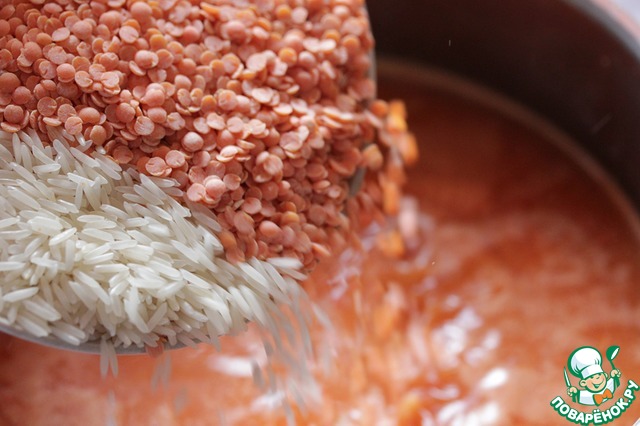 Пока суп закипает, отмерить необходимое количество риса и чечевицы.