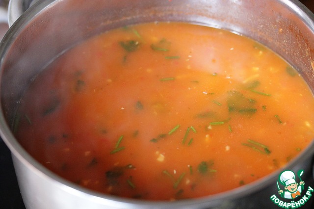 Готовить на небольшом огне примерно 10 минут. Не забудьте при править суп солью и перцем чили. Я еще добавляю чуть-чуть сахара, но это необязательно.