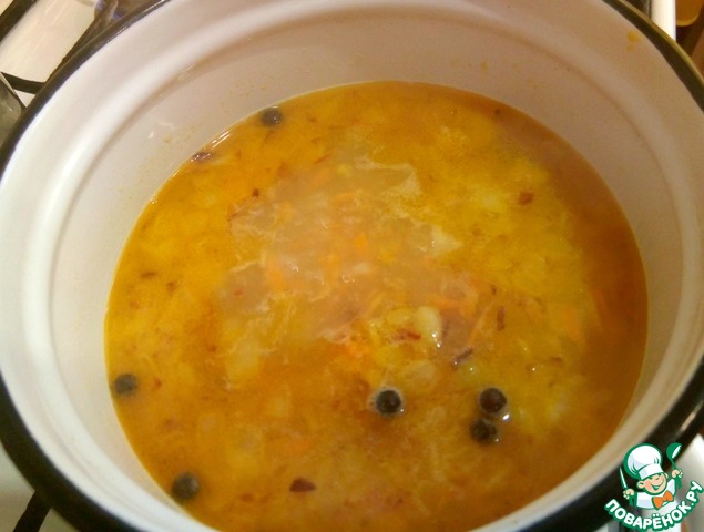 Теперь с помощью шумовки перекладываем отварную квашеную капусту в общую кастрюлю к овощам, доводим до кипения. Пробуем щи на вкус, солим и, добавляя отвар от капусты, регулируем кислоту щей по своему вкусу.