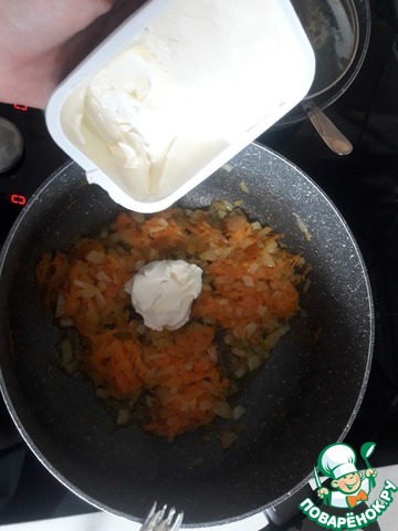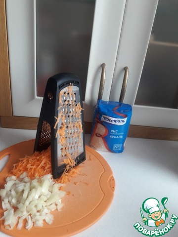 Очистить репчатый лук и морковь. Лук мелко нарезать, а морковь натереть на терке. Обжарить овощи в растительном масле до золотистого цвета.