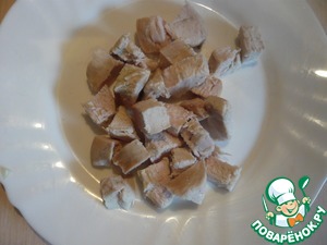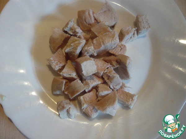 Отвариваем филе в 1л. бульона. Достаем и режем кубиком.