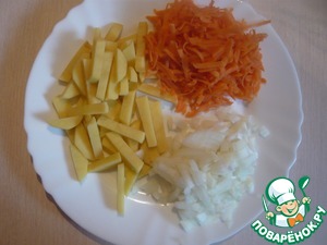 Лук режем мелким кубиком, морковь трем на терке, картофель режем брусочком.