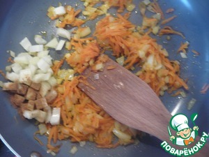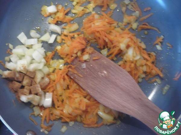 На масле пассеруем лук, морковь и чеснок. Добавляем перец чили и очищенный и порезанный кубиком сельдерей.