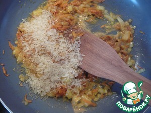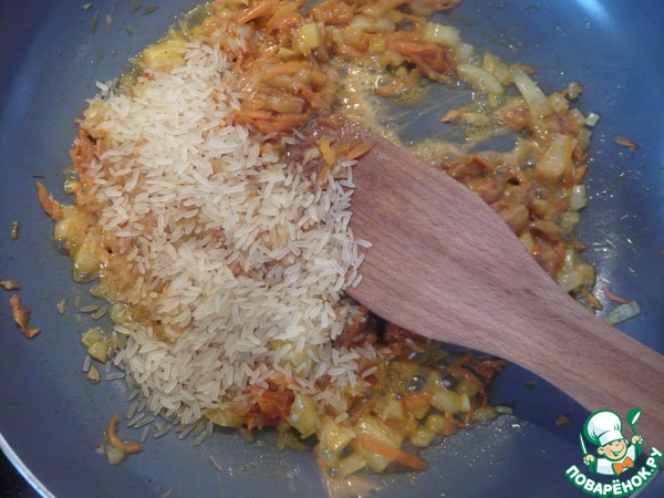 Добавляем к зажарке арахисовую пасту. Хорошо перемешиваем. Добавляем рис. Еще раз перемешиваем. Заливаем водой, так что бы вода покрывала рис. Тушим 7 мин., что бы рис впитал в себя аромат арахисовой пасты.