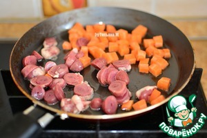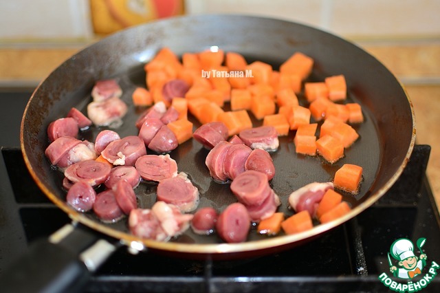 Куриные сердечки и морковь порезать произвольно, выложить в сковороду добавить масло.