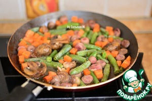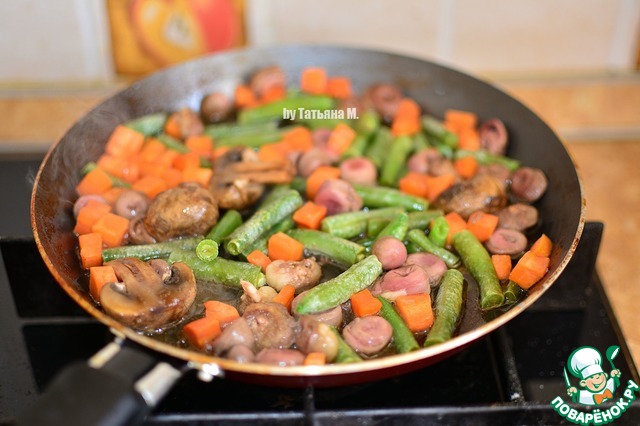 В сковороду добавить фасоль, резанные шампиньоны и соевый соус, тушить до готовности.