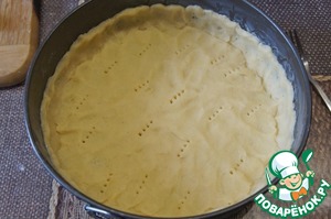 Разъемную форму d 24 см застелить пергаментом и выложить туда бОльшую часть теста. Многократно наколоть его вилкой. Выпекать корж около 10 минут.