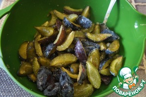 В это время сливы помыть, удалить косточки, разрезать на 4 части и смешать с сахарным песком и 1 ч. л. ванильного сахара.