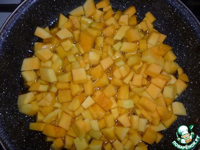 Тыкву нарезаем небольшими кубиками и отправляем на разогретую сковородку с подсолнечным маслом.