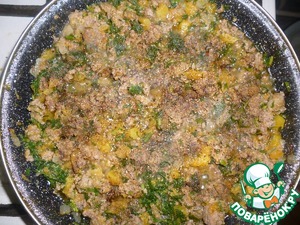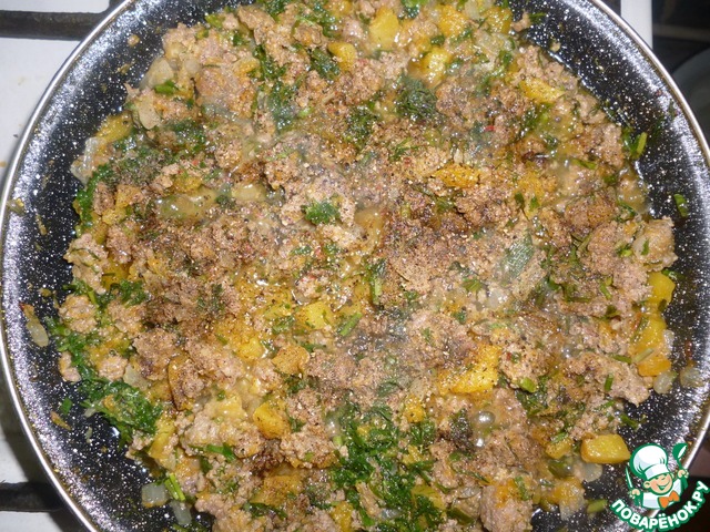 А теперь добавляем фарш и продолжаем жарить почти до его готовности.
