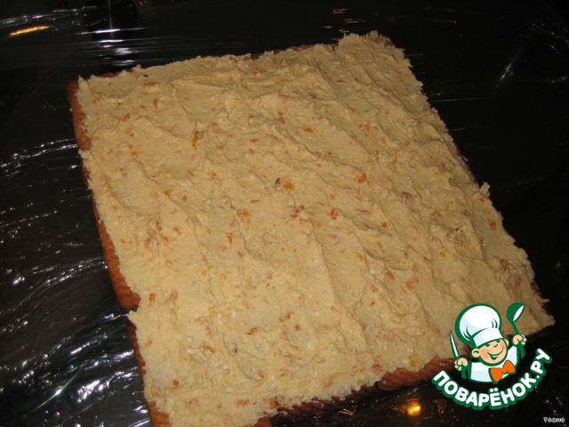 Выложить на слой печенья, слой творожной массы, ( у меня в пачках с курагой).