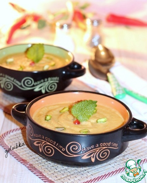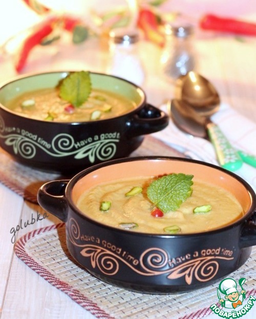 Разлейте суп по тарелкам, украсьте зеленью и фисташками. Сбрызните оливковым маслом и подавайте.