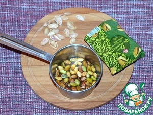 1. Обжарьте фисташки на сухой сковороде. Пересыпьте орехи в маленький сотейник, влейте столько воды, чтобы ее уровень был на 1 см выше уровня фисташек. Поставьте сотейник на огонь и варите 30 мин., до мягкости орехов.