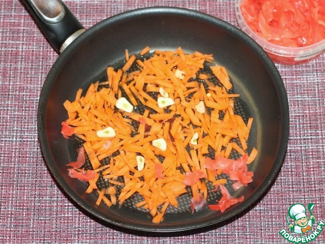 3. В большой кастрюле или сковороде с толстым дном, разогрейте оливковое и растительное масло (1:1) Положите морковь, чеснок и имбирь, жарьте, помешивая 3 мин.