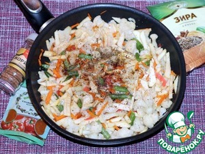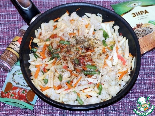 4. Добавьте очищенные и порезанные соломкой яблоки, лук, цветную капусту со стручковой фасолью. Всыпьте специи, посолите и поперчите. Перемешайте и жарьте 2-3 минуты.