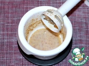 7. Затем смешайте фисташковый крем с тушёными продуктами и измельчите блендером. Переложите пюре в кастрюлю, добавьте оставшейся бульон и если нужно, приправьте еще раз солью и перцем. Бульон можно добавить по вкусу.