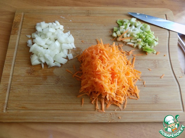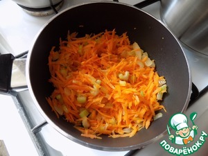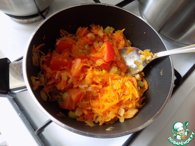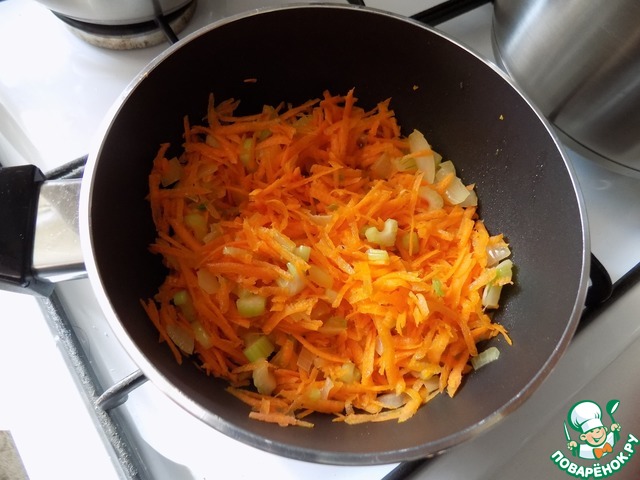По прошествию часа, параллельно сделала заправку в сотейнике. Для заправки приготовила овощи: лук, мелко резанный, натёртую морковь на средней тёрке и сельдерей черешковый, порезанный тонко дольками.