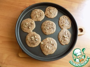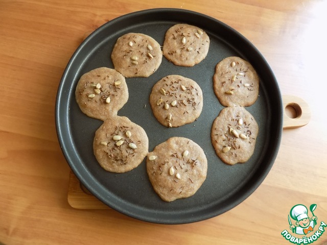 Также, пока варился суп, быстро в посуде замесила постные лепёшки. В воде лопаточкой соединила муку, сахар и соль. Налила подсолнечного масла, опять соединила и столовой ложкой выложила тесто на антипригарную форму. У меня в данном случае форма для пиццы D-24 см. На неё уложилось 8 шт лепёшек из этого теста. Присыпала лепёшки сверху тмином и семечками и поставила в разогретую духовку до т-180 С на 15 минут. Ориентируйтесь по своей духовке. У меня эл. духовой шкаф небольшой на 15 л. Печёт быстро. Лепёшки готовы.