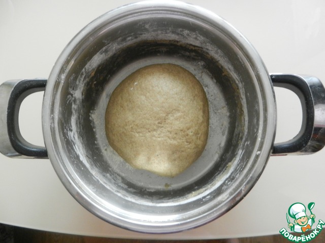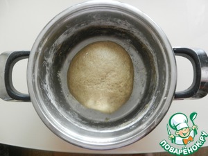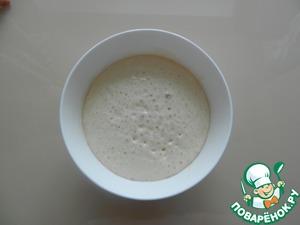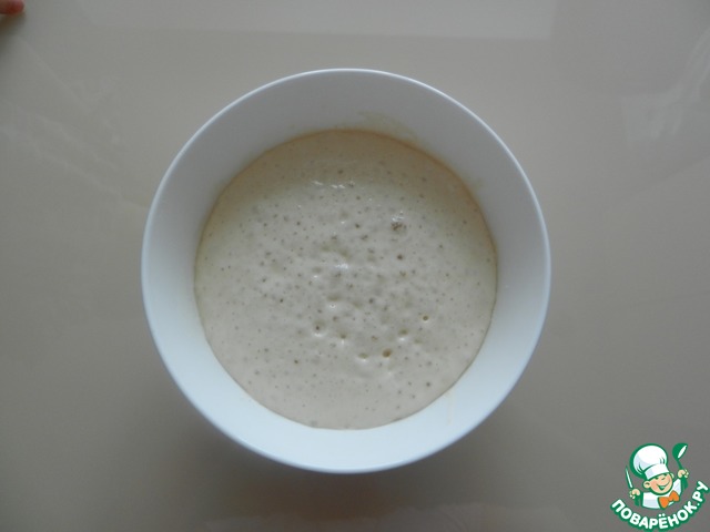 Начинаем с приготовления опары: смешиваем пшеничную муку, дрожжи и теплую воду, накрываем полотенцем и оставляем в теплом месте (или хотя бы без сквозняков) на 2 часа.