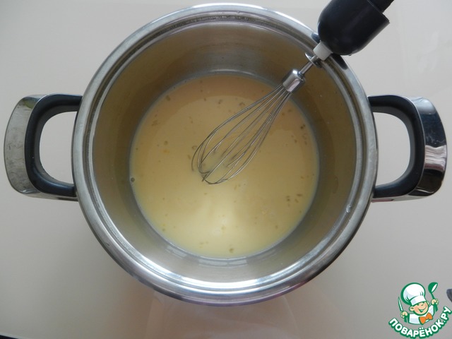 Когда опара готова, приступаем к тесту: в посуду разбиваем два яйца, венчиком перемешиваем и отливаем две столовые ложки яичной смеси для последующего смазывания наших коржиков перед выпечкой. Затем к яичной смеси добавляем молоко, сахар и соль. Все хорошо перемешиваем.