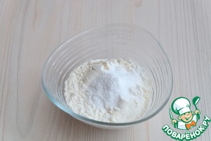 В миске соединить соду (1/2 ч. ложки) и муку (2 стакана). Смесь перемешать.