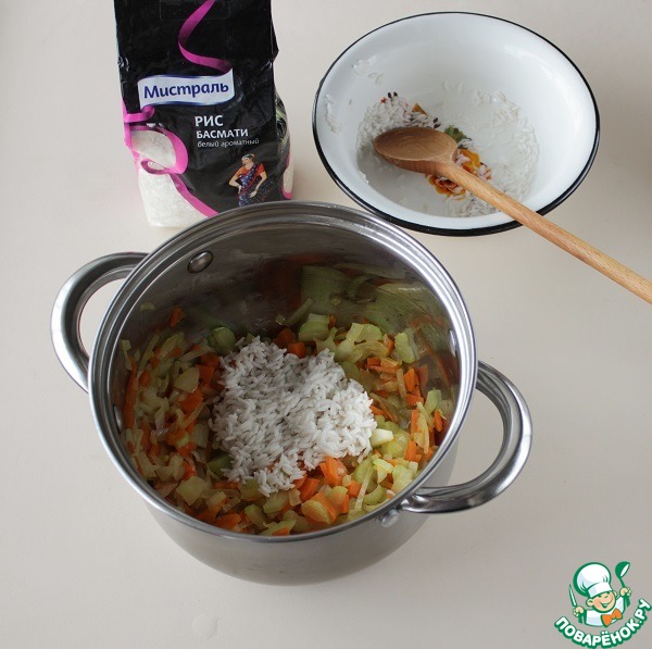 В кастрюле с толстым дном растопить масло, положить овощи, перемешать, обжарить на на среднем огне до прозрачности лука, не давая подгореть. Промыть рис басмати ТМ Мистраль, добавить к овощам, продолжить обжаривать минут пять. Рис придаст супу насыщенности и бархатистой структуры.