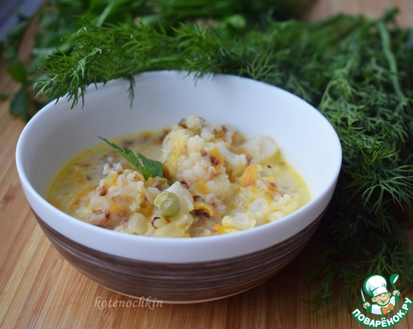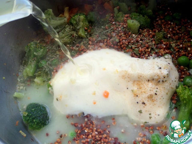 Далее два варианта: используем простую воду или бульон. У меня бульон на куриных грудках с приправами.