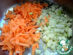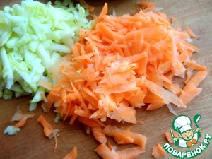 Луковицу измельчить. Насыпать морковь и лук в кастрюлю с толстым дном вместе с маслом.