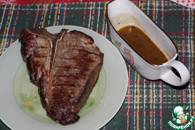 Стейк (сегодня это - t-bone из местной говядины) смазываем оливковым маслом, солим и перчим. Вообще среди кулинаров ломается много копий, надо солить стейк до или после. Я солю до.