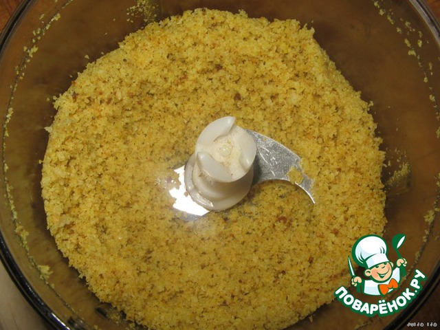 Сухарики измельчить в блендере. Можно взять и обычные панировочные сухари или любые домашнего приготовления. Так как у меня сухарики со специями, то я специй в запеканку не добавляю, а Вы можете добавить свои любимые.