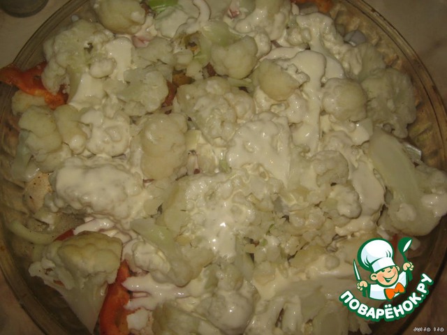 Слегка посолить, поперчить, и выложить цветную капусту, разобранную на соцветия.