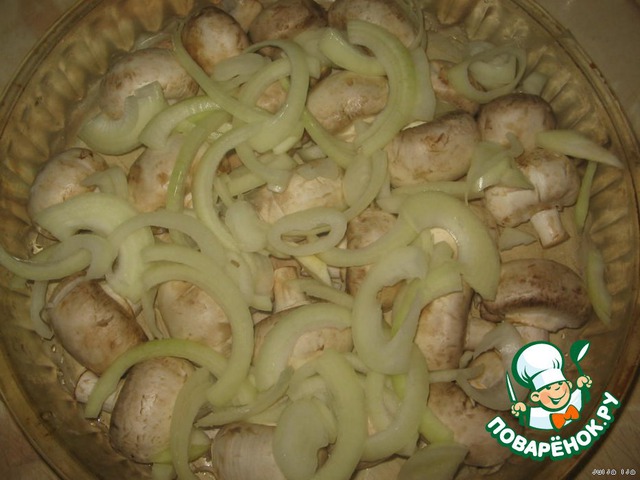 Лук нарезать полукольцами, выложить на шампиньоны.