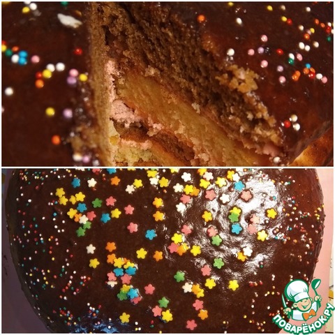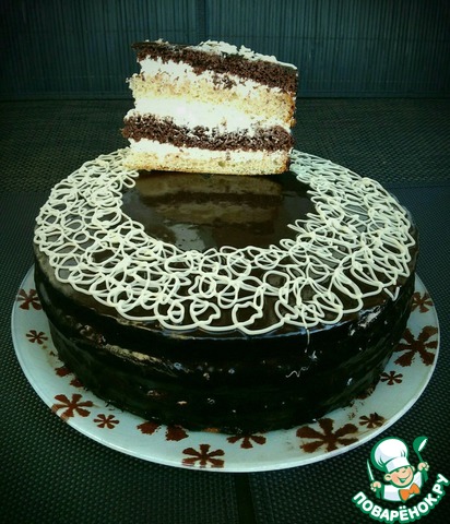 Перемазываем коржи кремом, чередуя темные с белыми. Крема не жалейте, бисквит его полностью впитает.
