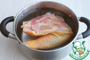 В кастрюлю с водой добавить куриный окорочек. Кастрюлю поставить на интенсивный огонь, при закипании снять пену. Огонь убавить до минимума, добавить в кастрюлю соль по вкусу, лавровый лист, 5-6 горошин душистого перца, варить окорочек до готовности.