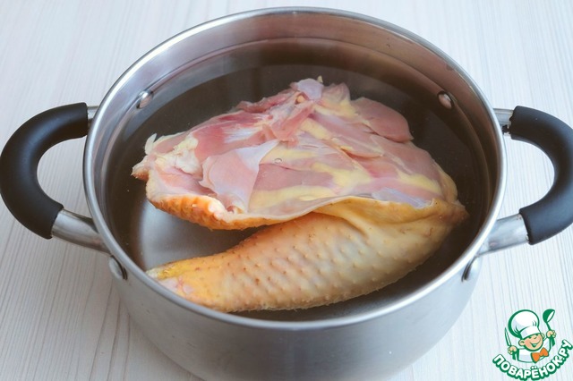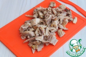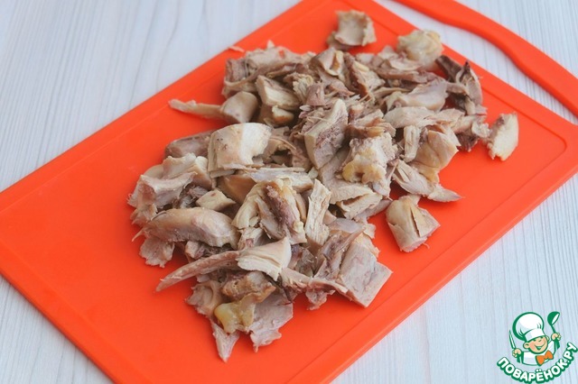 С отваренного окорочка снять мясо, нарезать мясо кубиками (кусочками).