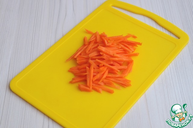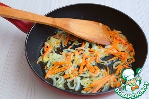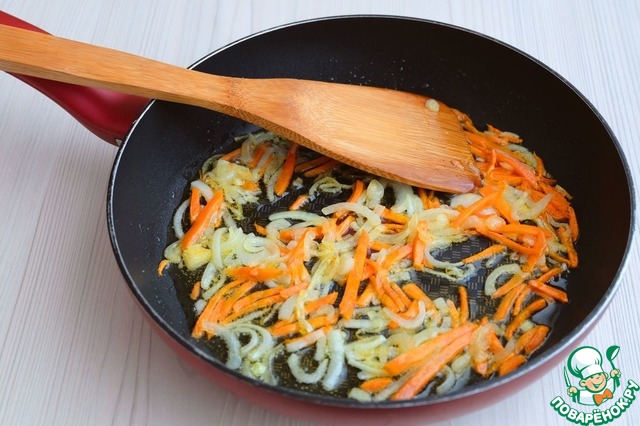 На сковороду добавить лук и морковь, добавить 4 ст. ложки растительного масла, пассеровать овощи до легкой золотистой корочки.
