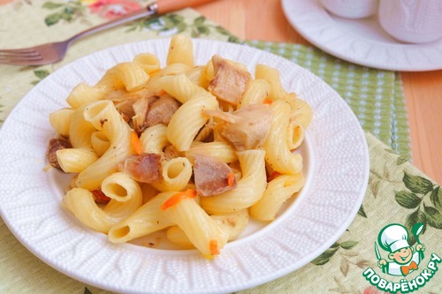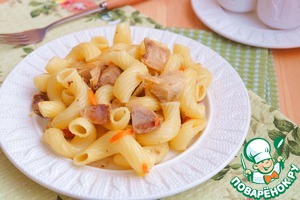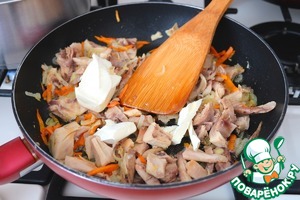 К пассерованным овощам добавить нарезанные кубики куриного мяса, добавить 50 гр. сливочного масла, добавить соль и черный молотый перец по вкусу. Слегка обжарить куриное мясо вместе с овощами. Отварить пасту в подсоленной воде до состояния Al dente. Далее воду слить, добавить пасту к обжаренному куриному мясу и овощам. Все хорошо прогреть на медленном огне. Блюдо готово.