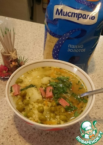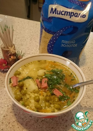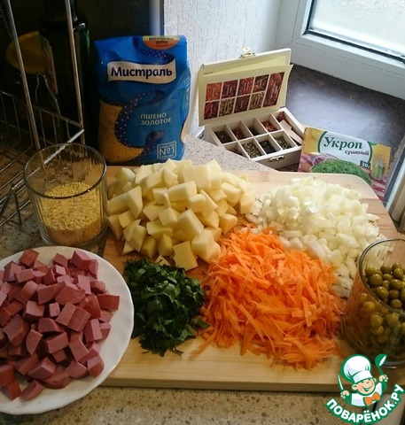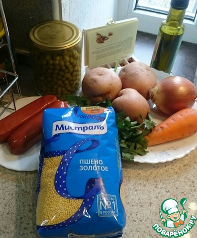 Продукты, которые понадобятся для приготовления супа. Я выбрала пшено золотое ТМ "Мистраль", т. к. оно очень чистое и придает нежно-желтый цвет бульону.