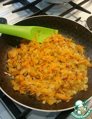 Пока варится пшено и картофель, разогреваем в сковороде оливковое масло и обжариваем лук и морковь.