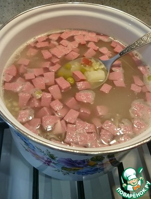 Минут за пять до готовности крупы добавляем в кастрюлю сардельки...