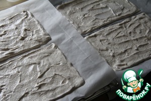 Духовку разогреть до 115- 125 градусов. 2 противня застелить бумагой с размеченными прямоугольниками (по 2 на противень) размером 18 х 25 и на них распределить белково-ореховую массу.