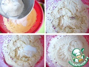 В масляно-яичную смесь просеить муку. Взбить или смешать до одногодного состояния.
