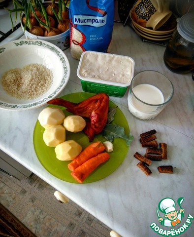 Ингредиенты для «Копчёный сырный суп с чесночными гренками»: