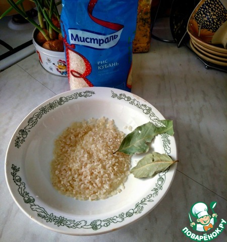 Промываем рис и лавровый лист. Высыпаем все это в слегка подсоленую кипящую воду и варим все это 5 мин.