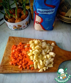 Картофель и морковь нарезаем мелкими кубиками, засыпаем все это в кастрюлю и варим все это 5-7 мин.